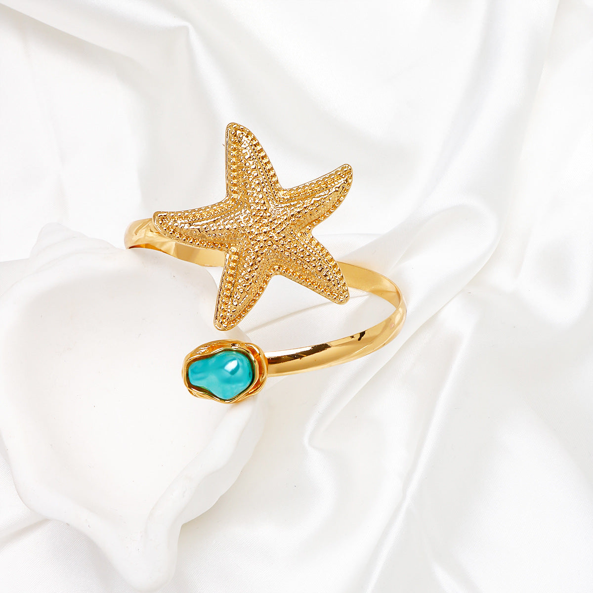 Embrace the beauty of the ocean with our Golden Starfish. This stunning open-bangle bracelet features a detailed starfish design paired with a luminous pearl-style accent, perfect for adding a beachy, sophisticated vibe to any outfit.